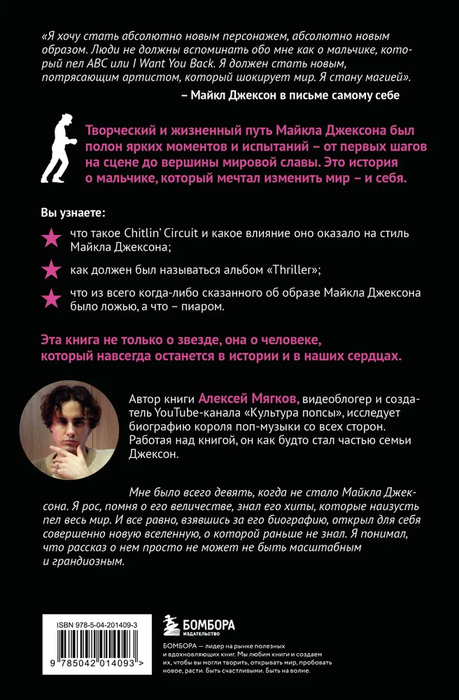Майкл Джексон — это не просто имя в истории музыки. Это целая эпоха, которая навсегда изменила представление о поп-культуре. Осознайте феномен Майкла Джексона и узнайте, почему жизнь короля поп-музыки была окружена таким количеством тайн и скандалов. Автор книги Алексей Мягков, видеоблогер и автор популярного канала «Культура попсы» показывает короля поп-музыки со всех доступных сторон, делая его образ в этой книге настоящим, живым и многогранным.