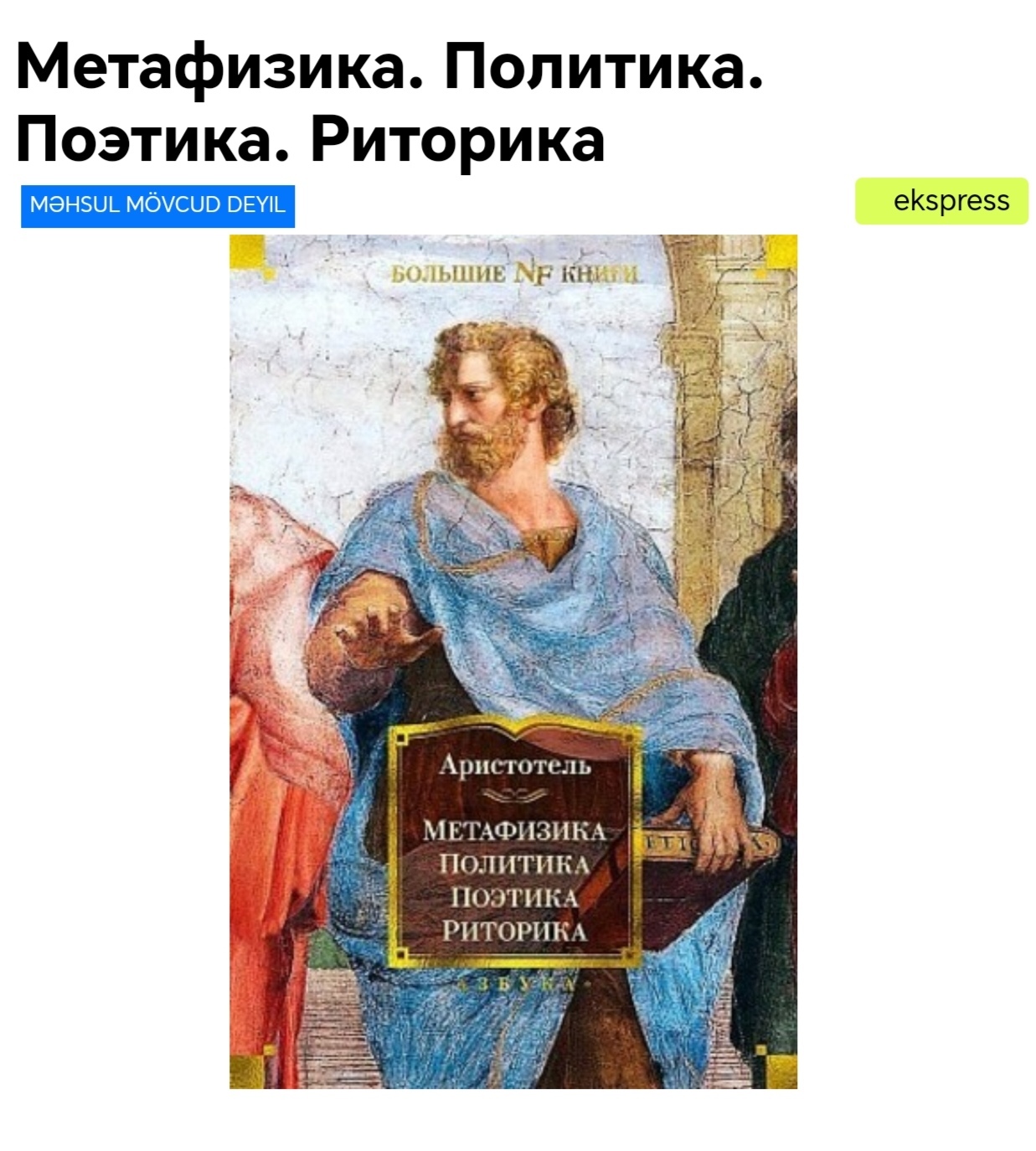 Salam. Aristotelin "Метафизика. Политика. Поэтика. Риторика" əsərlərinin olduğu kitabı sizdə yenidən olacaqmı? Kitab Azbuka nəşriyyatınındır, "Большие Книги" seriyasındandır.