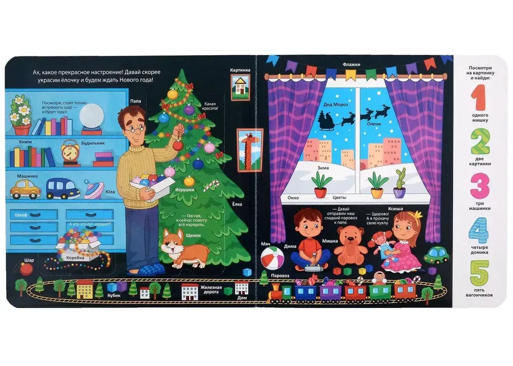 Книга «Волшебный Новый год» из серии «Мои первые слова» – это уютные семейные приготовления к главному зимнему празднику, ёлка и подарки, угощения, снег, каток и хоровод. Яркие картинки надолго задержат внимание малыша, а слова в окошках помогут расширить словарный запас и развить память. На каждом развороте приготовлено интересное задание на смекалку и внимательность. Играйте, читайте, учите новые слова, погружайтесь в новогоднюю атмосферу и заряжайтесь отличным настроением!