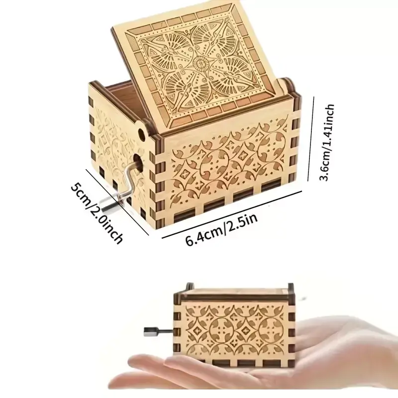 Taxta materialdan hazırlanmış, nəfis naxışlarla işlənmiş əl işi musiqi qutusu. Uşaqlar və böyüklər üçün istifadəsi uyğundur.