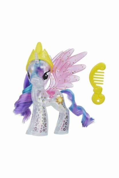 В ассортименте «Пони блёстками» представлено несколько чудесных наборов с фигуркой пони, короной и расческой для её великолепной гривы. Фигурки выполнены из пластика, украшены блёстками и оснащены подвижными крылышками, а вот их волосы – мягкие текстильные. Размер фигурки: 7,5 см. В ассортименте представлены следующие персонажи: Принцесса Селестия Принцесса Каденс Принцесса Луна Принцесса Сумеречная Искорка