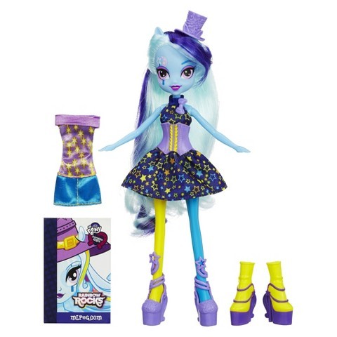 Кукла My Little Pony Equestria Girls "Модница Трикси" в точности повторяет внешний вид героини из мультфильма. Кукла выполнена в виде девочки-пони Трикси. Ее эффектный образ создан специально для выступления на рок-концерте. Девочке непременно понравится расчесывать и заплетать ее длинные голубые волосы. Куколка одета в синее платье с корсетом, украшенное звездным принтом, на ногах у нее - фиолетовые туфельки. Стильный образ дополняет фиолетовая шляпка-цилиндр.