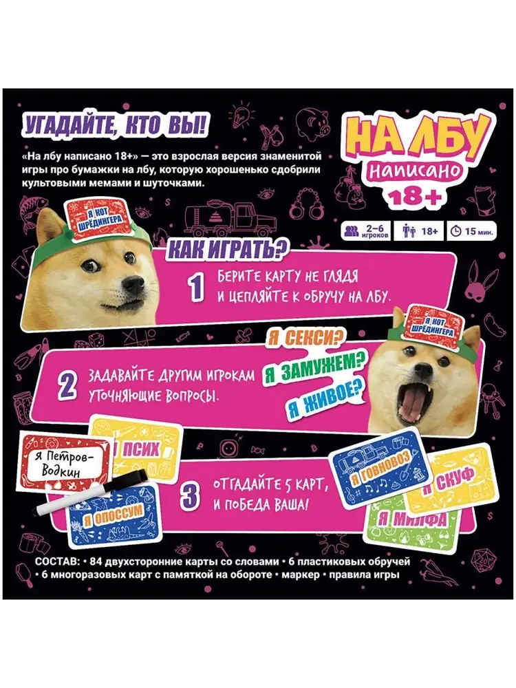 Это взрослая, остроумная и местами абсурдная версия классической "На лбу написано" – игры про угадывание слов. Здесь вас ждут не только обычные понятия, но и мемы, шутки и каверзные формулировки, которые заставят хохотать до слёз. Игра идеально подойдёт для весёлой компании друзей, которые не откажутся лишний раз подшутить друг над другом, не боятся выглядеть комично и даже нелепо и готовы на всё ради победы! Механика проста – задавайте вопросы, получайте подсказки и пытайтесь угадать, что же написано у вас на лбу, пока не истекут 30 секунд.