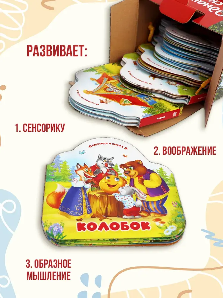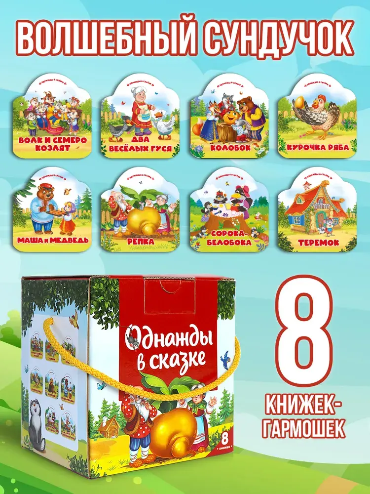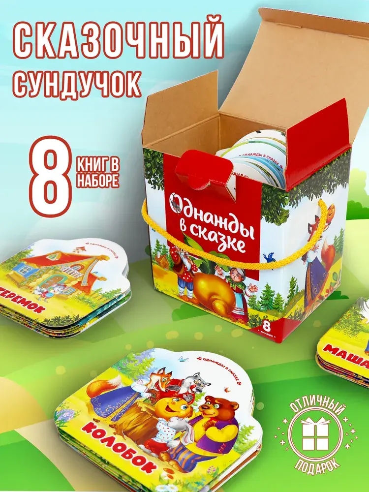 Подарочный набор «Однажды в сказке» — это 8 миниатюрных книжек в компактном сундучке, который украсит любую книжную полку. В коллекцию вошли самые известные и любимые сказки для малышей: «Репка», «Колобок», «Теремок», «Курочка Ряба», «Маша и медведь», «Сорока-белобока», «Два веселых гуся» и «Волк и семеро козлят». Двусторонняя книжка-гармошка с красочными иллюстрациями, которые сопровождают сказочные сюжеты и делают чтение ещё более интересным и увлекательным. Большие буквы помогут легко прочитать каждое слово. Книга сделана из качественного и плотного картона, который имеет высокую прочность и влагоотталкивающие свойства. Яркая и контрастная печать делает картинки максимально насыщенными. Книгу удобно взять с собой на прогулку или в дорогу.