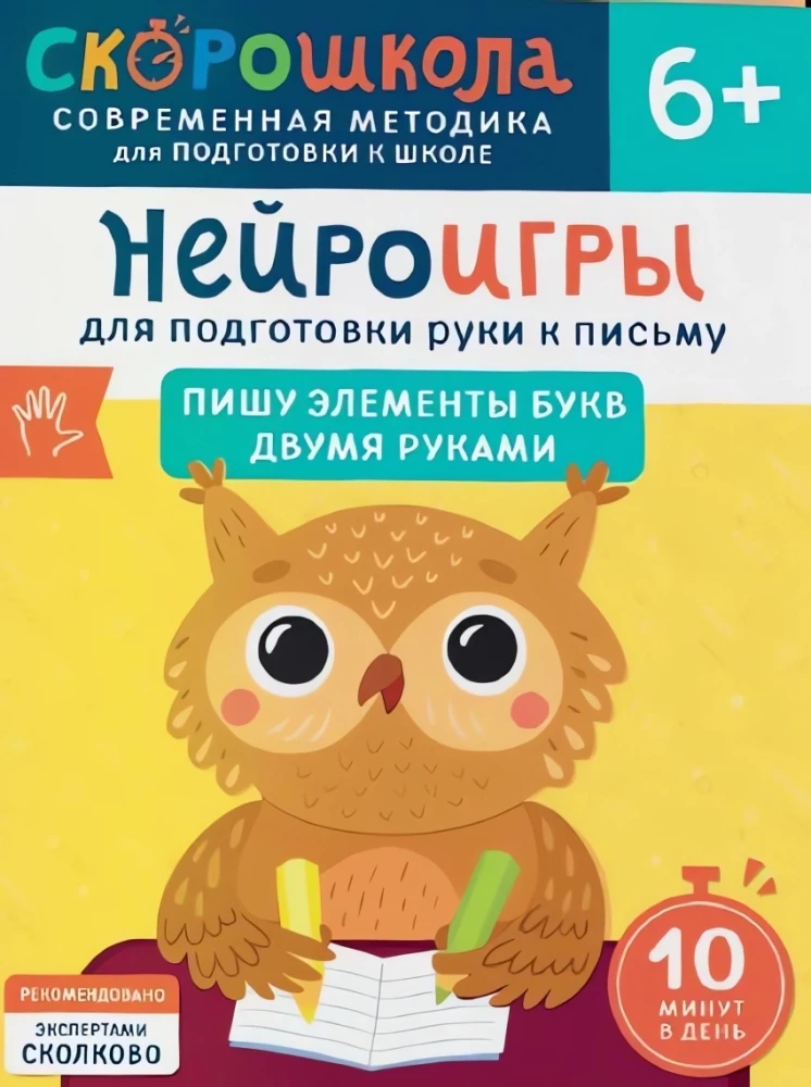 Рабочая тетрадь «Нейроигры для подготовки руки к письму. Пишу элементы букв двумя руками» для детей от 6-ти лет содержит увлекательные задания для дошкольников и подробные инструкции для родителей. Упражнения составлены в игровой форме по принципу от простого к сложному. Занимаясь всего по 10 минут в день, ребенок: