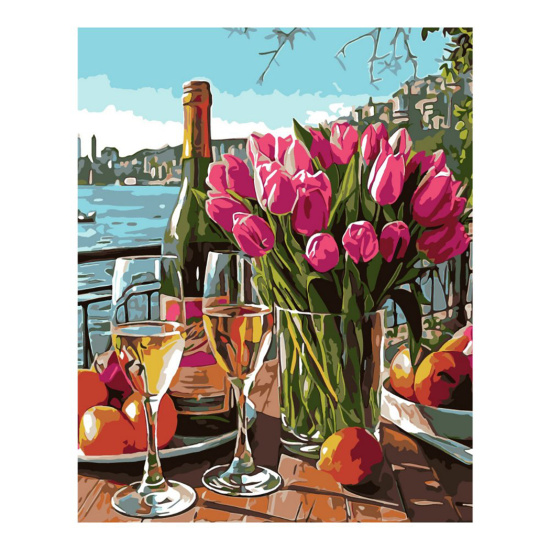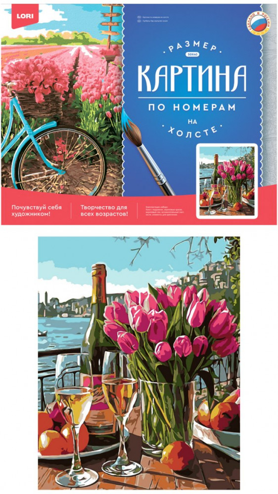 В набор входит картинка для раскрашивания, на которую нанесена нумерованная схема рисунка, набор акриловых красок и кисть.