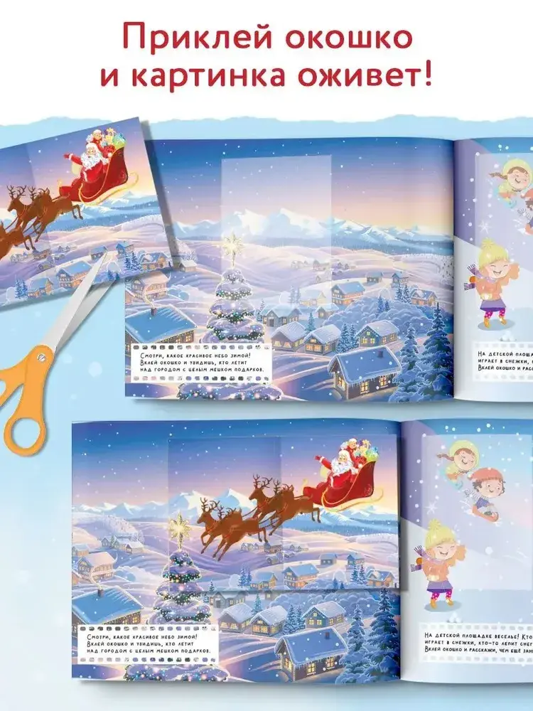Серия "Моя волшебная книга с окошками" действительно полна волшебства. Ведь в ней нарисованные изображения оживают по-настоящему! Вырежьте окошко, приклейте в специальную рамку и… На новогодней ёлке появятся яркие украшения, дети слепят снеговиков, а над городом засияют разноцветные огни праздничного салюта. Данная книга станет для детей отличным подарком на Новый год.Ребёнок проведёт время с пользой: выполнит увлекательные задания и научится усидчивости. Также книга поможет в развитии мелкой моторики и нестандартного мышления.Для занятий взрослых с детьми (текст читают взрослые).Для дошкольного возраста.