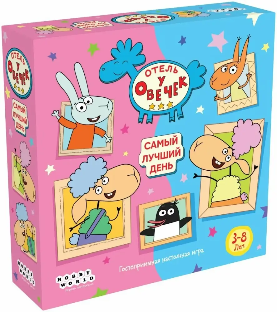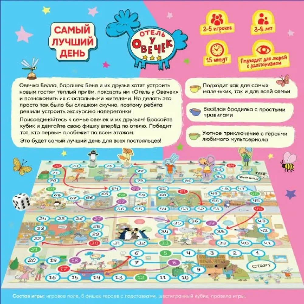 Присоединяйтесь к дружной компании овечек и их друзей в увлекательной настольной игре «Отель с овечками: Лучший день в жизни» для детей и взрослых! Бросайте кубик, перемещайте свою фишку по этажам отеля и стремитесь к победе. Первый, кто обойдёт все этажи, выигрывает. Вас ждёт самый весёлый день для всех обитателей отеля!