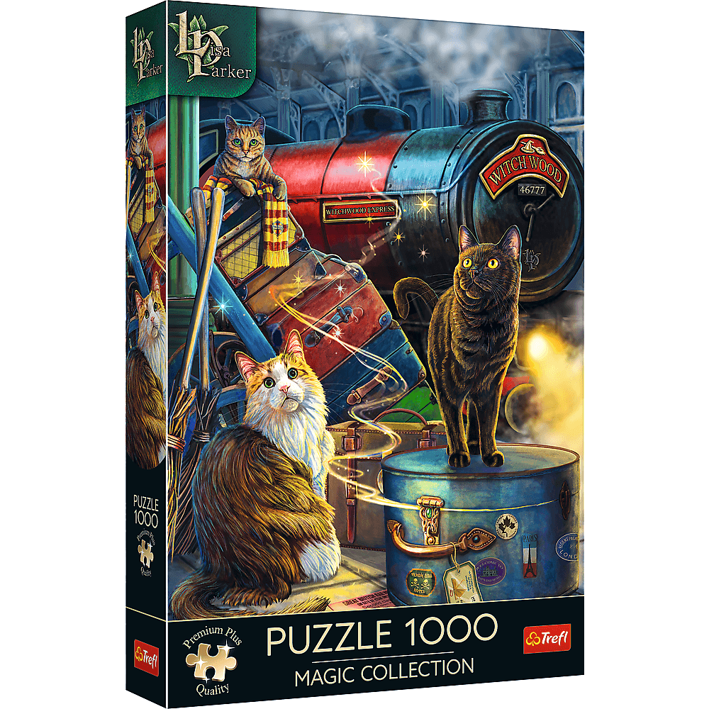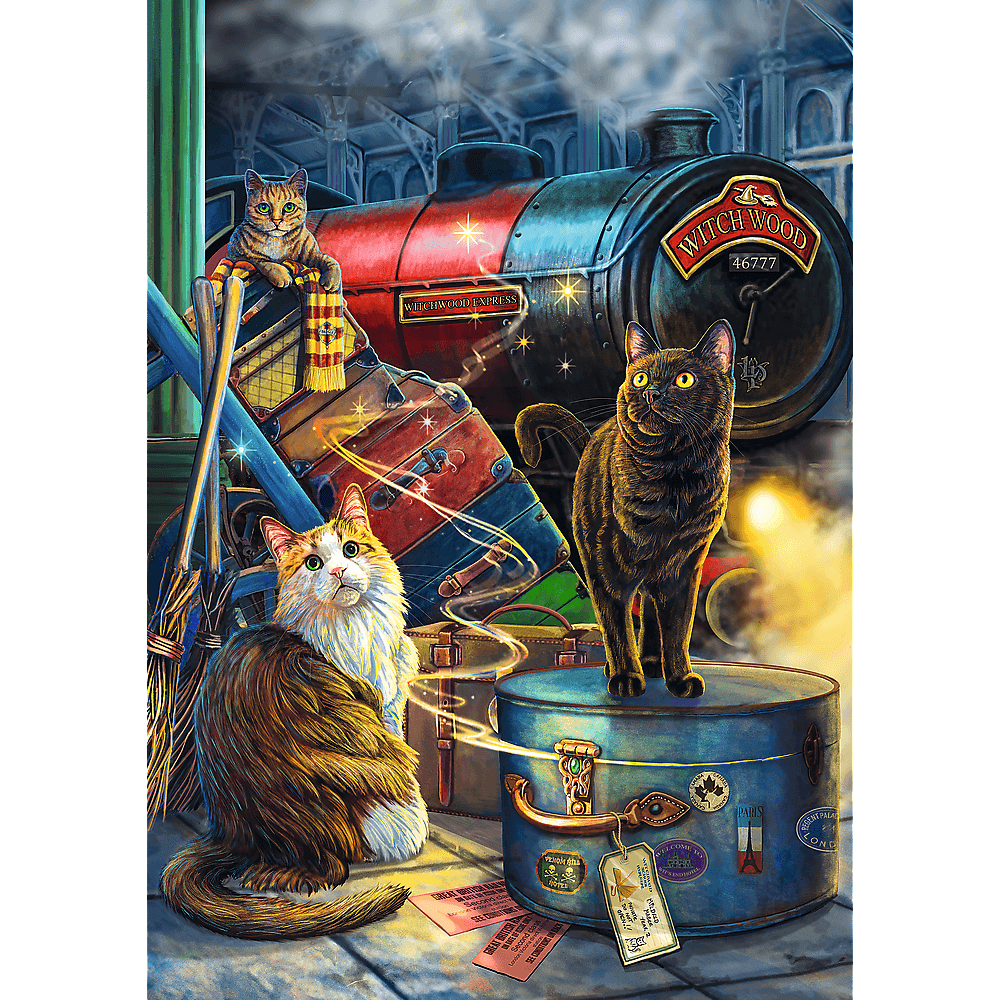 В головоломке «Экспресс ведьм» изображены кошки, ожидающие среди багажа путешествия на волшебном поезде для ведьм. После их компоновки будет создано изображение размерами 683х480 мм.
