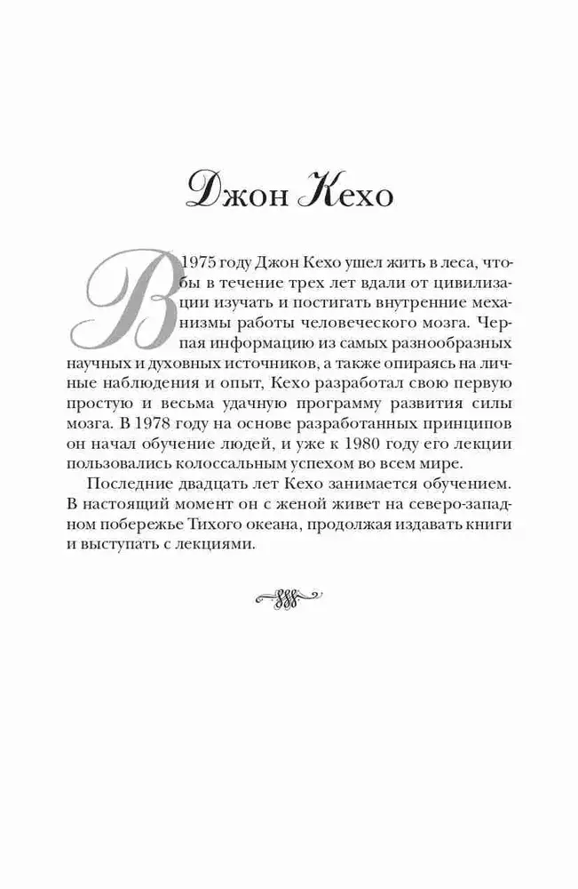 Автор этой книги в уединении среди лесов канадской провинции Британская Колумбия три года сосредоточенно размышлял над вопросами, касающимися деятельности человеческого мозга. Способы активизации его безграничных ресурсов, разработанные и скомбинированные Джоном Кехо в конкретную программу, могут изменить Вашу жизнь к лучшему, наполнить её успехами и счастьем.