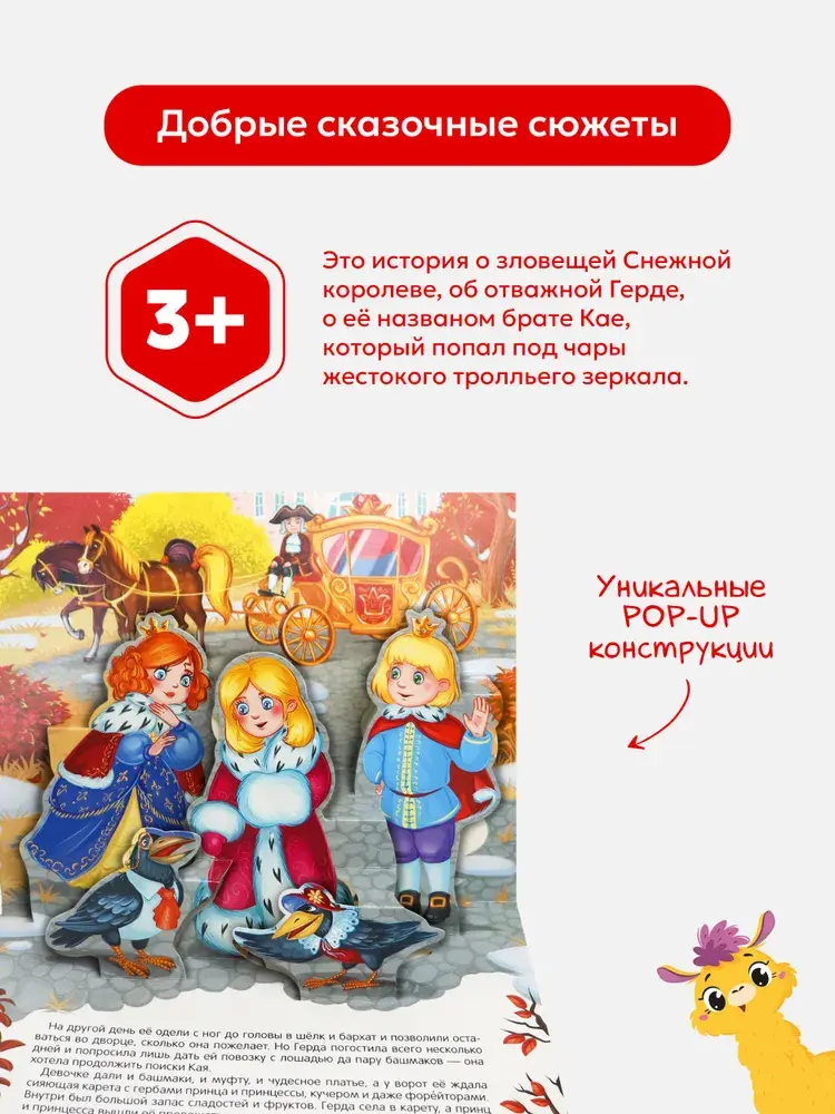 "Снежная королева" — удивительная сказка датского писателя Г.Х. Андерсена в формате книги-панорамки с объемными иллюстрациями. 3D развороты создают ощущение дополненной реальности и настоящего путешествия в сказку, в которой рассказывается об истинной дружбе, верности, настоящей любви и о победе добра над злом. Книга сделана из качественного и плотного картона. Яркая и контрастная печать делает картинки максимально насыщенными. Порадуйте своего ребёнка уже знакомой и полюбившейся многим сказкой про Герду и Кая с объёмными иллюстрациями, которые удивят вашего малыша!