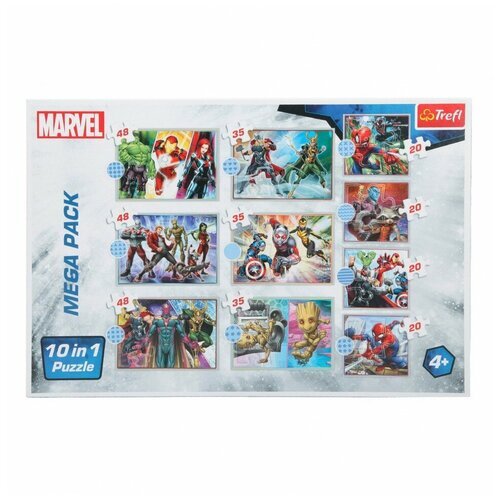 Пазл Тrefl 10в1 это сразу десять пазлов в одной коробке с культовыми героями из фильмов Марвел. Ребенок с удовольствием будет собирать изображения, каждый раз погружаясь в сказочную историю. Различное количество элементов позволяет играть как малышам, так и детям постарше. Могут играть сразу несколько детей одновременно. Пазлы изготовлены из качественных материалов с применением специальной бумаги. Содержимое коробки: 3 пазла 48 элементов (223x156 мм), 3 пазла 35 элементов (223x156 мм), 4 пазла 20 элементов (156x167 мм). Для детей от 4 лет.