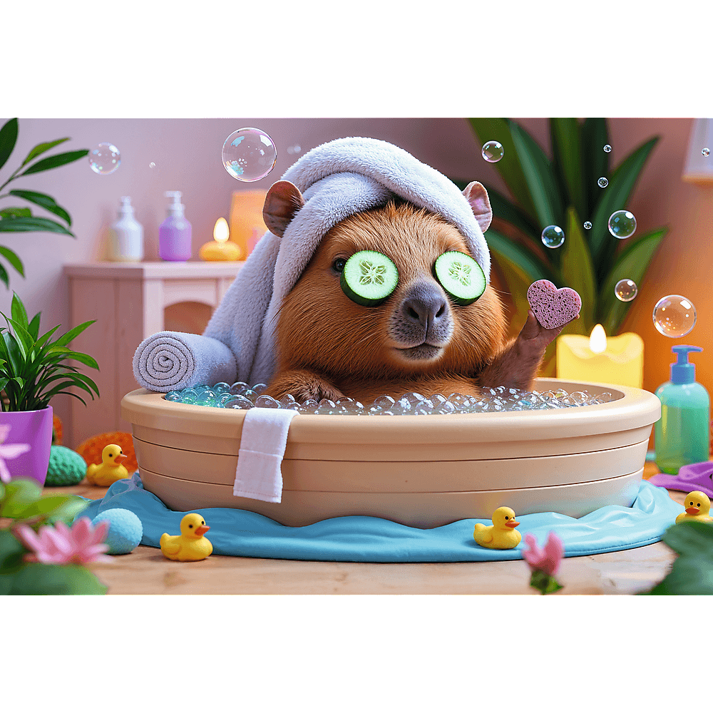 «Капибара в спа» — это пазл из 160 деталей , который порадует юных любителей животных. В собранном виде изображение размером 410 x 275 мм изображает капибару, отдыхающую в домашнем спа.