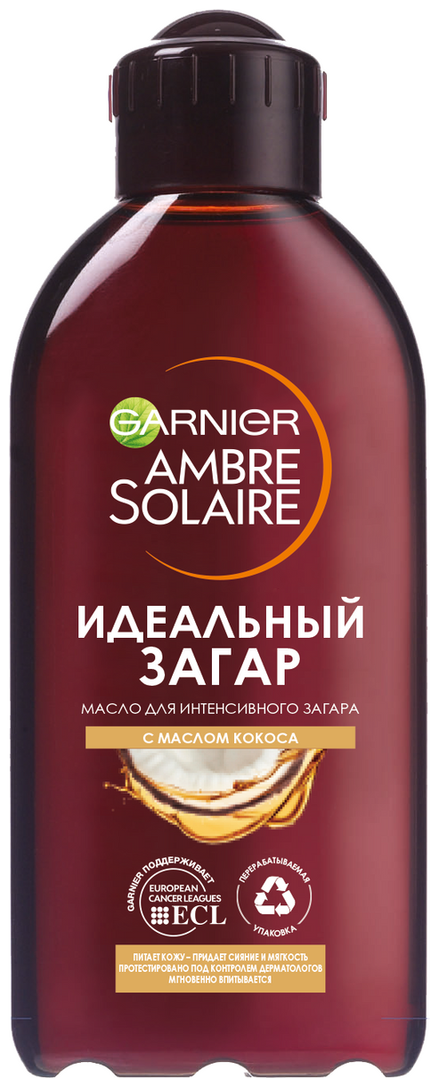 Garnier Ambre Solaire стремится предоставить вам надежную защиту от солнца c 1935 года. Мы также обязуемся заботиться о вашей коже с помощью нашего масло для интенсивного загара. Масло от Гарньер питает и смягчает кожу, одновременно придаёт ей сияние, необычайную мягкость и по-летнему приятный кокосовый аромат. Подходит для тех, кто желает приобрести более интенсивный загар. Масло для интенсивного загара, популярное среди любителей солнца, создано на основе питательной формулы и очень удобно в использовании. 1. Придает сияние. 2. Питает. 3. Смягчает. 4. Придает красивый загар. СПОСОБ ПРИМЕНЕНИЯ: Нанести непосредственно на кожу, избегая области вокруг глаз. Во время пребывания на солнце используйте солнцезащитные средства с высокой степенью защиты, подходящие вашему типу кожи. Это масло "Идеальный загар" не защищает от солнечных лучей. В случае попадания в глаза немедленно и тщательно промойте их водой. Избегайте контакта с одеждой до полного впитывания.