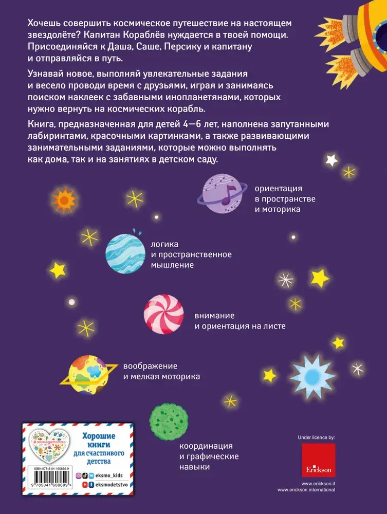 Красочное развивающее пособие поможет любознательному ребёнку совершить удивительное космическое путешествие на необычные планеты (фиолетовую, голубую, красную, жёлтую и зелёную). Во время этого полёта ребёнок будет выполнять игровые задания, развивая при этом пространственное мышление, внимание, фантазию, мелкую моторику, координацию, познавательные способности. Книга в качестве подарка на новый год может заменить целый подарочный набор. Найдите свой идеальный новогодний подарок!