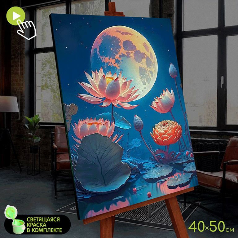 Комплектация: основа - 1 шт, краски - 28 шт, кисть - 3 шт, инструкция - 1 шт, люминесцентная краска - 2 шт, крепление для картины - 1 шт.