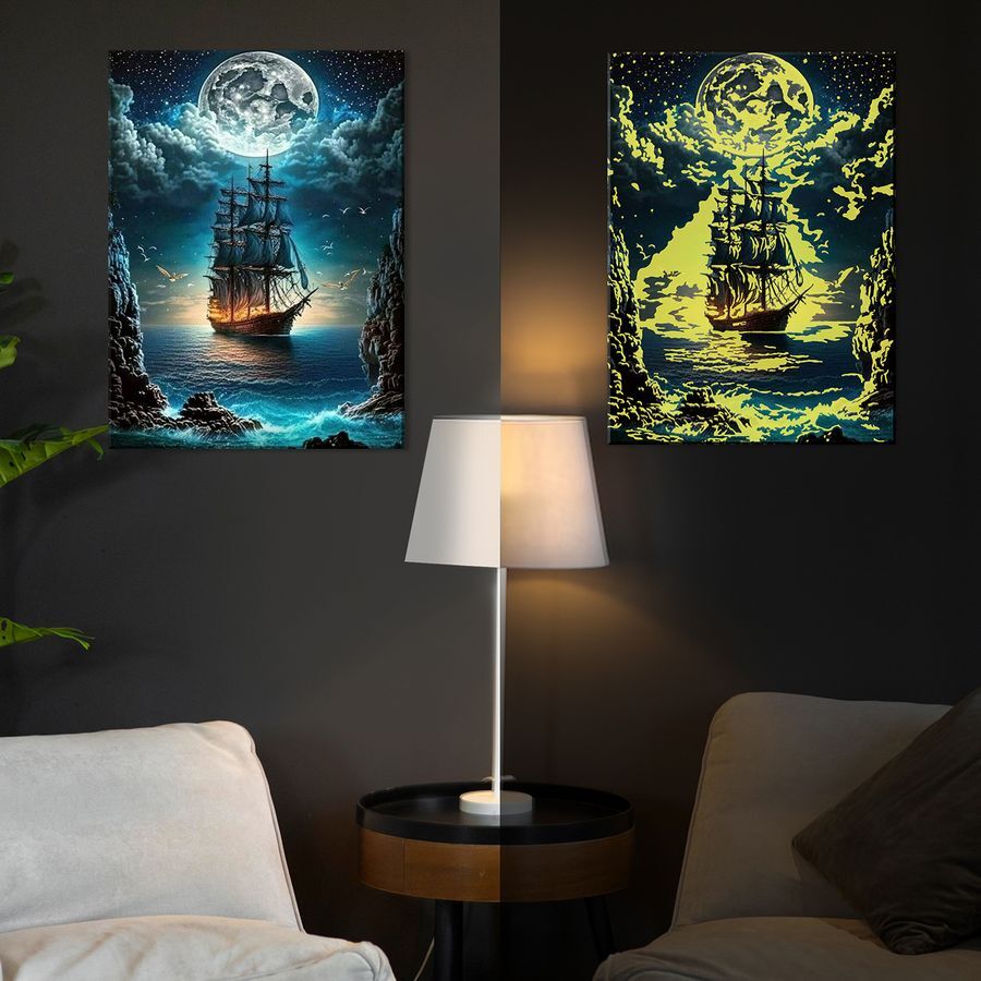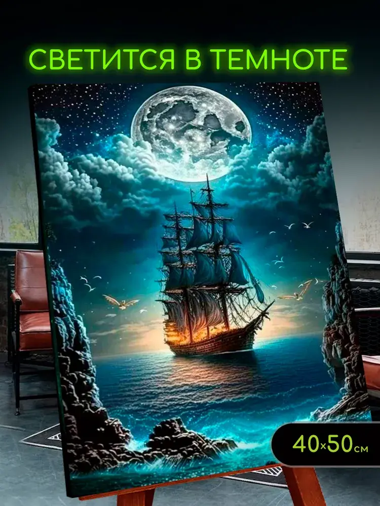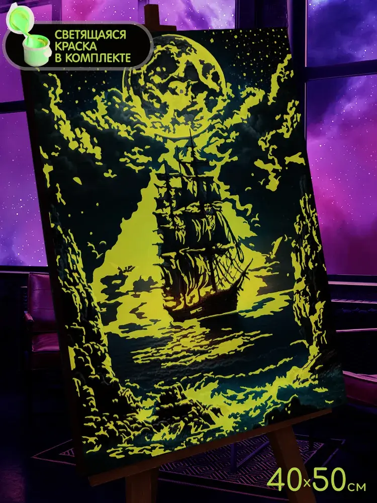 Картина по номерам со светящейся краской 40х50 Корабль в лунном свете – это набор для творчества с помощью которого, используя краски и кисть, можно нарисовать потрясающую картину, даже не обладая художественными навыками. Картина по номерам, которая светиться в темноте, создает новый уровень творчества. Этот набор для рисования – идеальное хобби для детей и взрослых. Картина выполняется на натуральном холсте, который надежно крепится на деревянный подрамник. Кисти в руках помогают расслабиться и забыть о суете дня. Каждый набор содержит всё необходимое для рисования настенного декора. Сюжет картины украсит интерьер. Рисование люминесцентной раскраски положительно влияет на развитие ребенка и способствует развитию навыков ручной работы у взрослых.