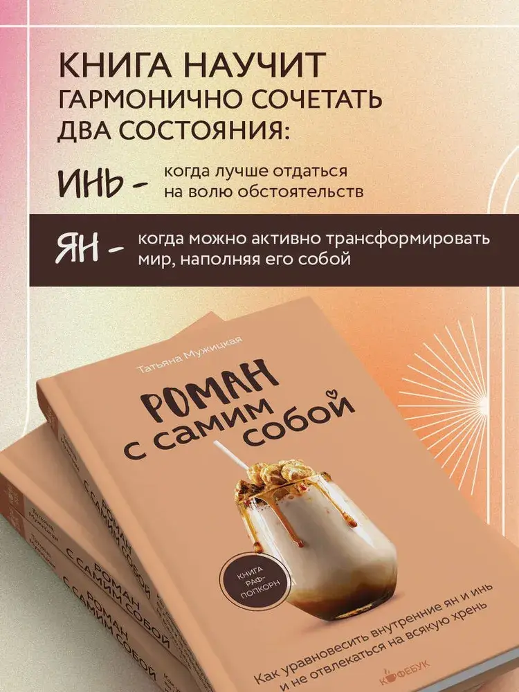 Книга раф-попкорн "Роман с самим собой" расскажет вам, что любить себя – это выбирать свободу, точно знать, чего вы хотите, и не сомневаться в будущем. Татьяна Мужицкая, известный психолог, делится техниками, как соединять в себе энергии инь и ян, получать удовольствие от жизни и не переживать, что бы ни происходило.