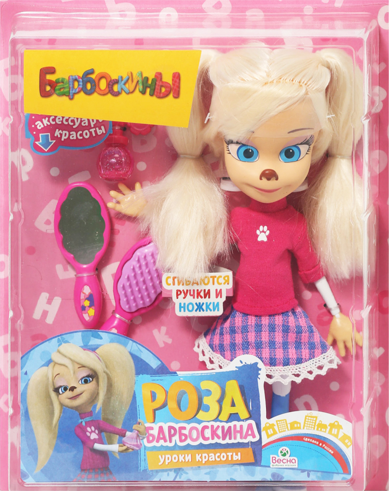 Кукла Роза Барбоскина - это очаровательная героиня любимого мультсериала "Барбоскины". Красавица-блондинка, которая обожает моду и мечтает стать певицей и актрисой! В комплект входит набор аксессуаров: расческа, зеркальце, духи. Подвижные ручки и ножки сгибаются в суставах. Густые и длинные волосы легко расчесывать, завивать и укладывать в прически, меняя образ куклы. Роза одета в узнаваемый повседневный наряд: розовый свитер с лапкой и юбка в клетку. Одежда пошита качественно, застегивается сзади на липкую ленту. Наличие у куклы элементов одежды, которые легко снимаются и надеваются, разнообразят возможности сюжетно-ролевых игр. Это способствует развитию мелкой моторики и творческого воображения ребенка. Высота куклы 30 см. Кукла произведена и сертифицирована в России. Соответствует Техническому регламенту Таможенного Союза о безопасности игрушки.