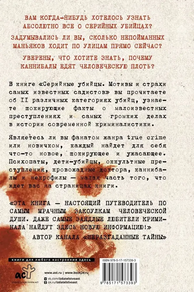 В книге "Серийные убийцы". Мотивы и страхи самых известных садистов" Джек Роузвуд раскрывает самые шокирующие подробности о серийных убийцах. Помимо актуальной информации о текущих делах, вы прочитаете об 11 различных категориях убийц, узнаете шокирующие факты о малоизвестных преступлениях и о самых известных злодеях. Являетесь ли вы фанатом жанра true crime или новичком, каждый найдет для себя что-то новое, шокирующее и ужасающее. Психопаты, дети-убийцы, оккультные серийные убийцы, кровожадные доктора, каннибалы и некрофилы — малая часть того, что ждет вас на страницах книги.