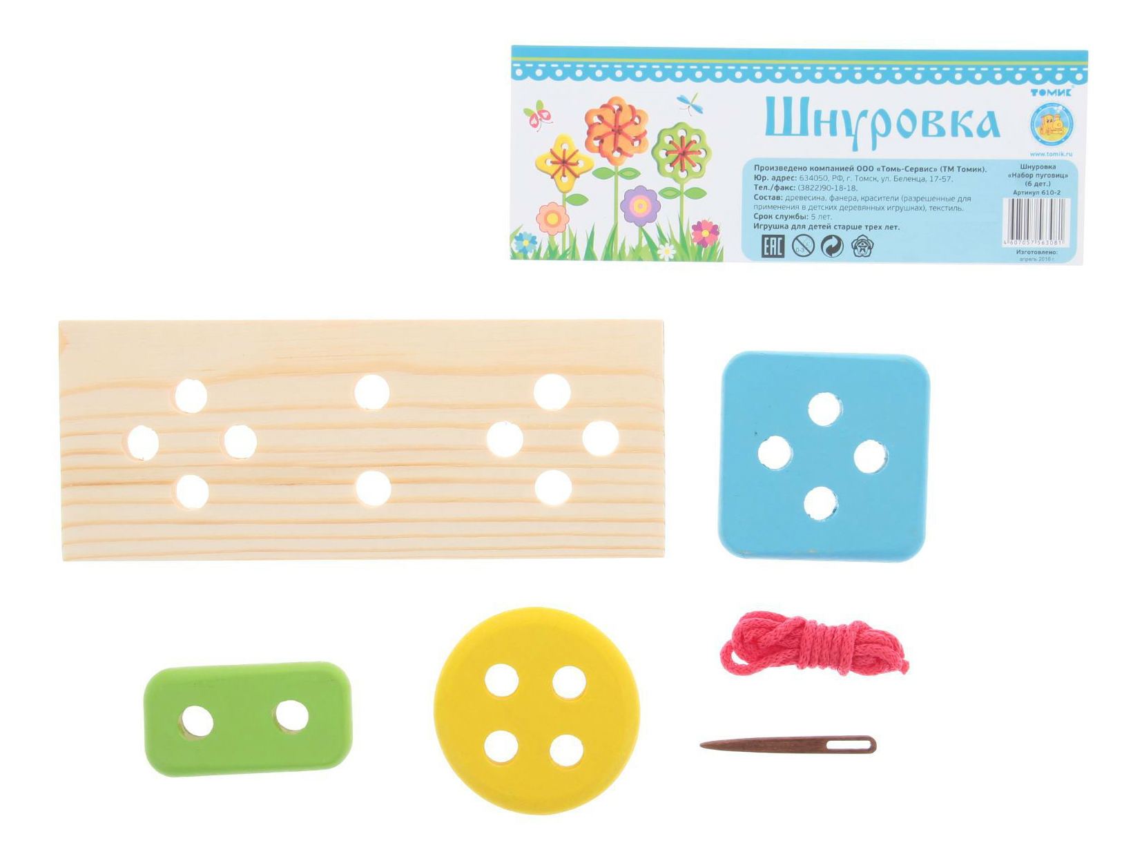 Шнуровка деревянная "Набор пуговиц".Количество деталей: 6Состав: древесина, фанера, красители, разрешенные для применения в детских деревянных игрушках, текстиль.Для детей старше 3-х лет.Сделано в России.