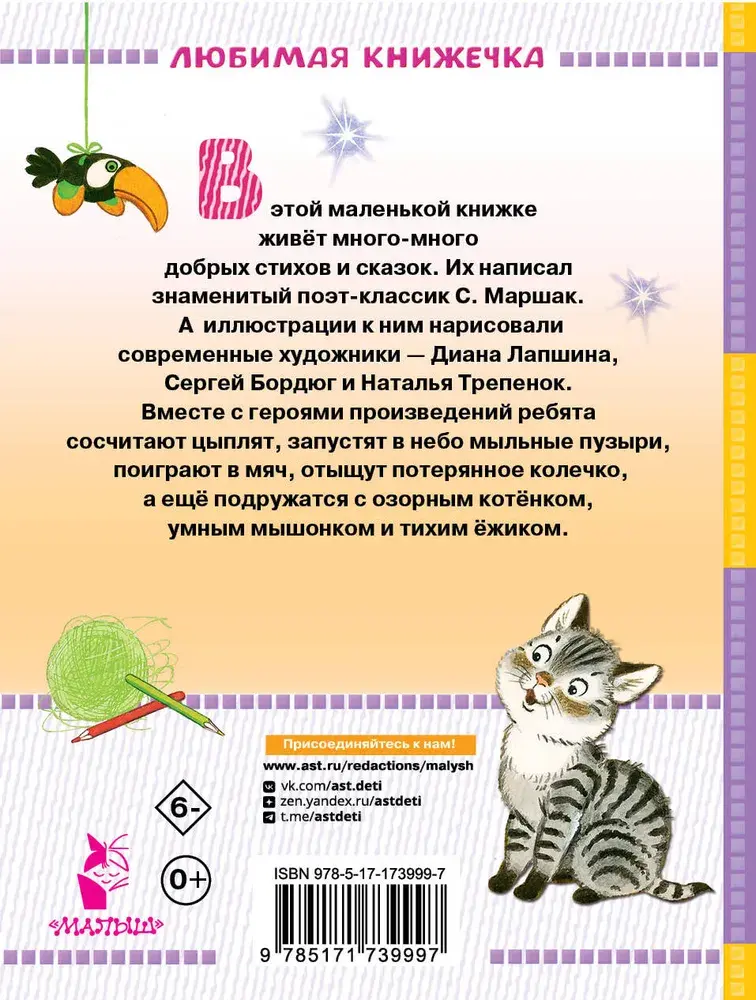 Лучшие произведения классика детской литературы, знаменитого поэта, писателя и переводчика Самуила Яковлевича Маршака вошли в эту прекрасно иллюстрированную книгу от издательства «Малыш». Это «Великан», «Цирк», «Кто колечко найдёт?», «Большой карман» и другие стихи с прекрасными современными иллюстрациями Дианы Лапшиной, а также сказки «Усатый-полосатый», «Сказка о глупом мышонке», «Сказка об умном мышонке» и «Тихая сказка» с иллюстрациями С. Бордюга и Н. Трепенок.