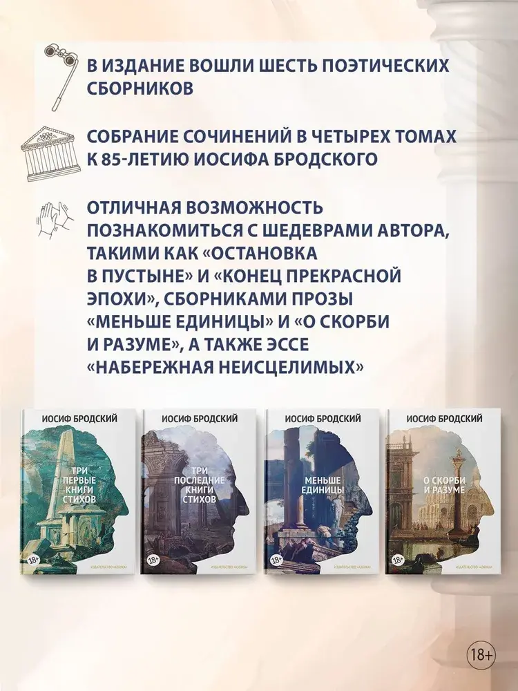 Настоящее издание приурочено к юбилею Иосифа Бродского (1940–1996). В него вошли шесть поэтических сборников, увидевших свет в американском издательстве «Ардис» («Остановка в пустыне», «Конец прекрасной эпохи», «Часть речи», «Новые стансы к Августе», «Урания» и «Пейзаж с наводнением»), сборники прозы «Меньше единицы» и «О скорби и разуме», а также эссе «Набережная Неисцелимых». Основанный на авторских составах, этот четырехтомник включает в себя основной корпус творческого наследия великого поэта.