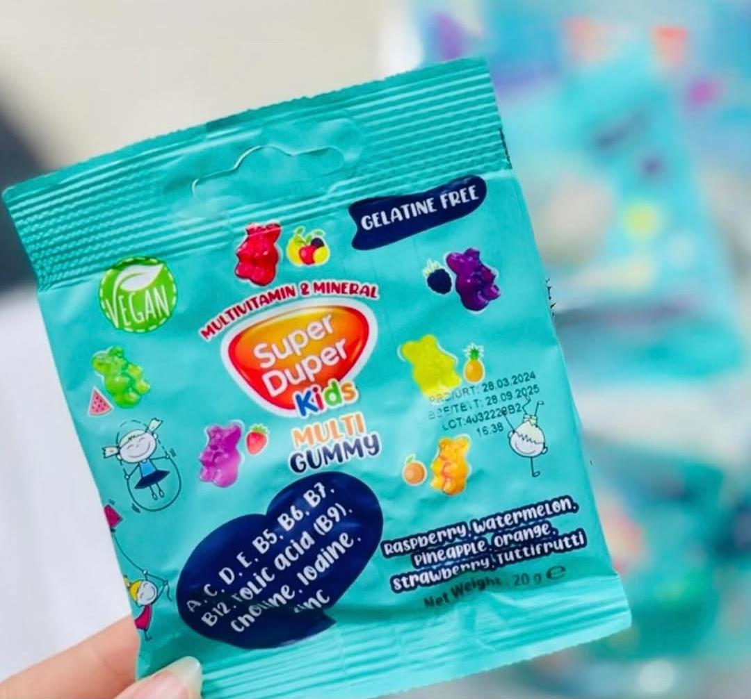 Super Duper Kids – jelatinsiz (gelatine free) şirniyyat uşaqlar üçün xüsusi hazırlanmış dadlı və təhlükəsiz qəlyanaltıdır. Tərkibində heyvani jelatin olmadığı üçün daha yüngül və alternativ seçim hesab olunur. Rəngli və maraqlı formaları ilə uşaqların diqqətini cəlb edir, həm də gündəlik qəlyanaltı üçün uyğun seçimdir.