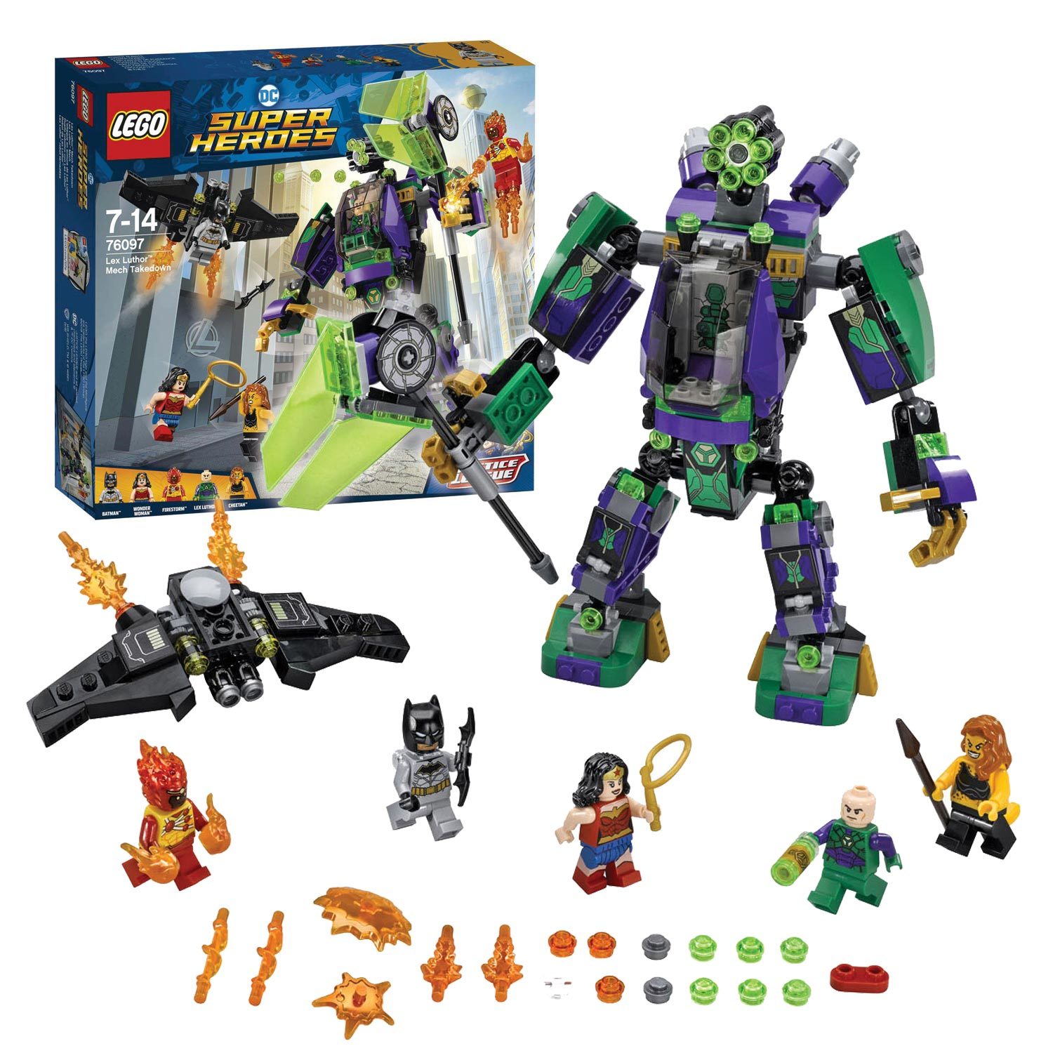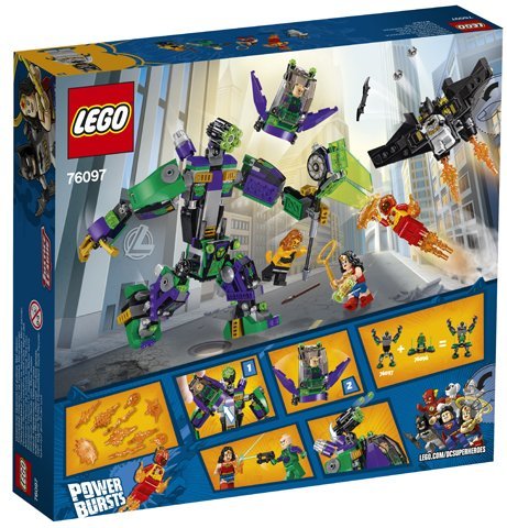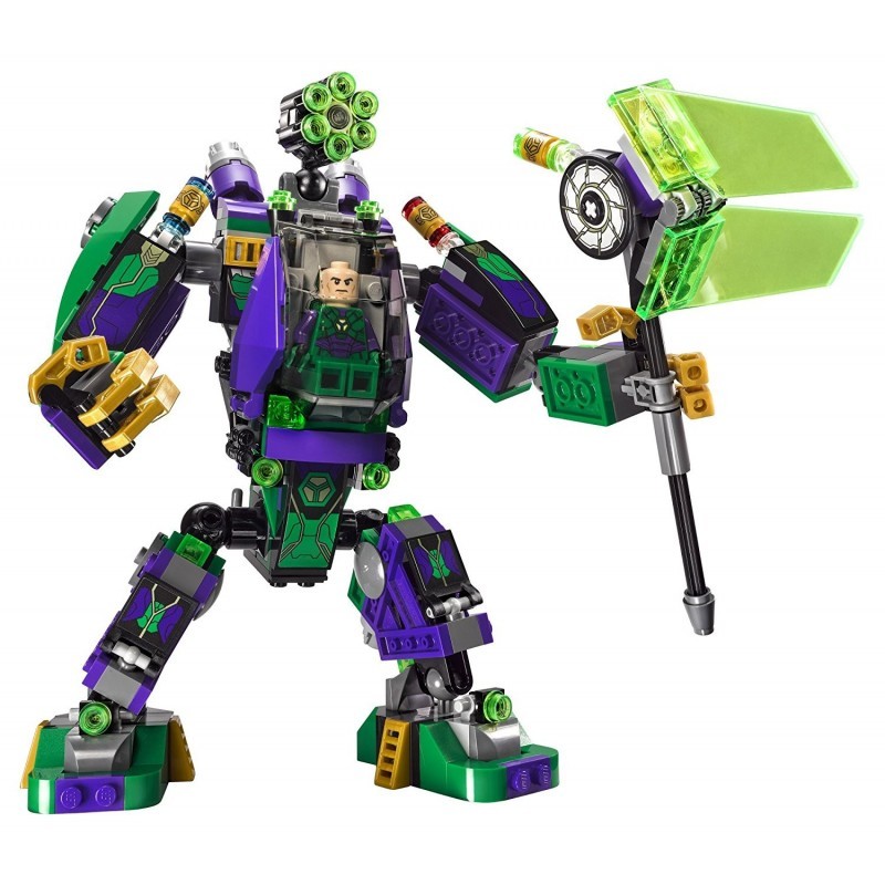 Играть с ним можно как в одиночку, так и большой дружной компанией. В комплект набора входит: 406 деталей; 5 минифигурок; Робот Лекса Лютора; Глайдер; Накопитель энергии; Множество дополнительных игровых аксессуаров и элементов декора. Особенности и игровой функционал: За управление роботом легко помещается минифигурка; Робот обладает подвижными руками и ногами; В руки робота можно вложить молот; Кабина с управлением может отсоединяться от основной конструкции робота, превращаясь в спасительную капсулу; В кабине управления есть рычаги; Детали конструктора при совмещении с набором 76096 позволяют создать новую конструкцию.