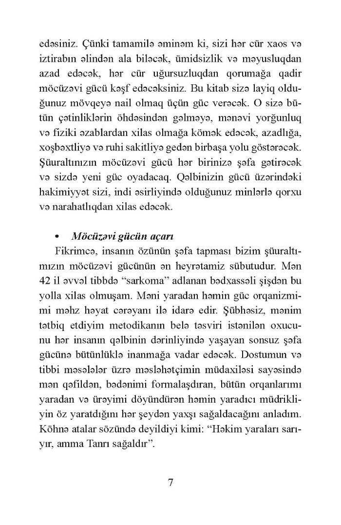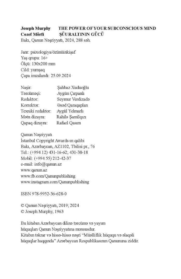 “Şüuraltının gücü” kitabında Jozef Mörfi şüuraltına təsir üçün çoxsaylı sadə metodlar göstərir. Əgər onları düzgün tətbiq etsəniz, bu sizə şüuraltı problemi yaranarkən düzgün həll yolunu tapmağa, yüksək əxlaqi dəyərlər qazanmağa və pis vərdişlərdən xilas olmağa kömək edəcək.