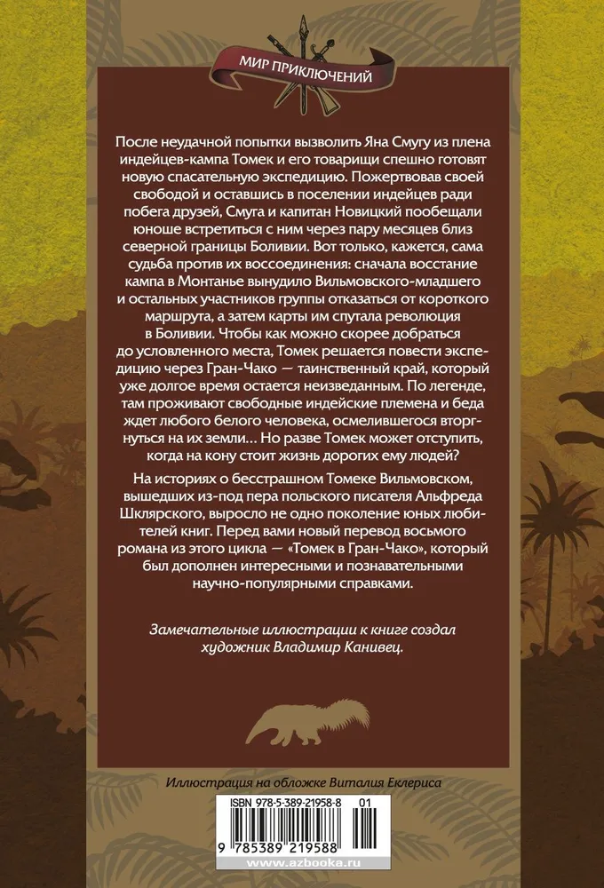 На историях о бесстрашном Томеке Вильмовском, вышедших из-под пера польского писателя Альфреда Шклярского, выросло не одно поколение юных любителей книг. Перед вами новый перевод восьмого романа из этого цикла — «Томек в Гран-Чако », который был дополнен интересными и познавательными научно-популярными справками. Замечательные иллюстрации к книге создал художник Владимир Канивец.