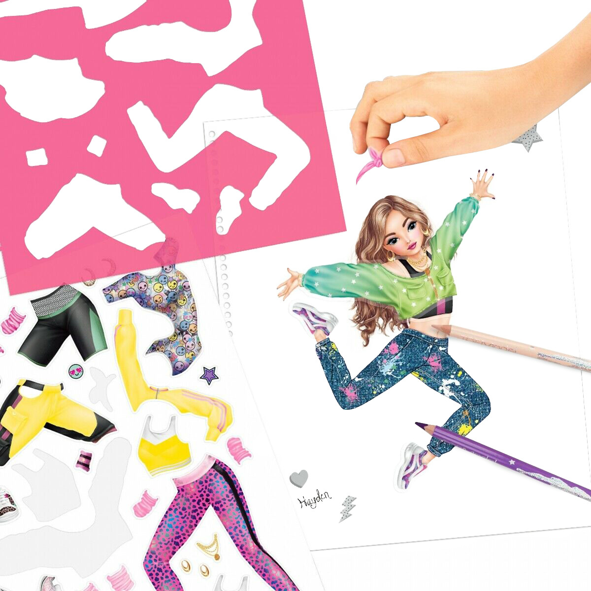 Новая книжка-раскраска TOPModel Dance: 30 страниц для раскрашивания с 3 трафаретами, 8 страниц рисунков ткани (на бумаге) и 2 листа прозрачных наклеек. Для множества креативных танцевальных образов!