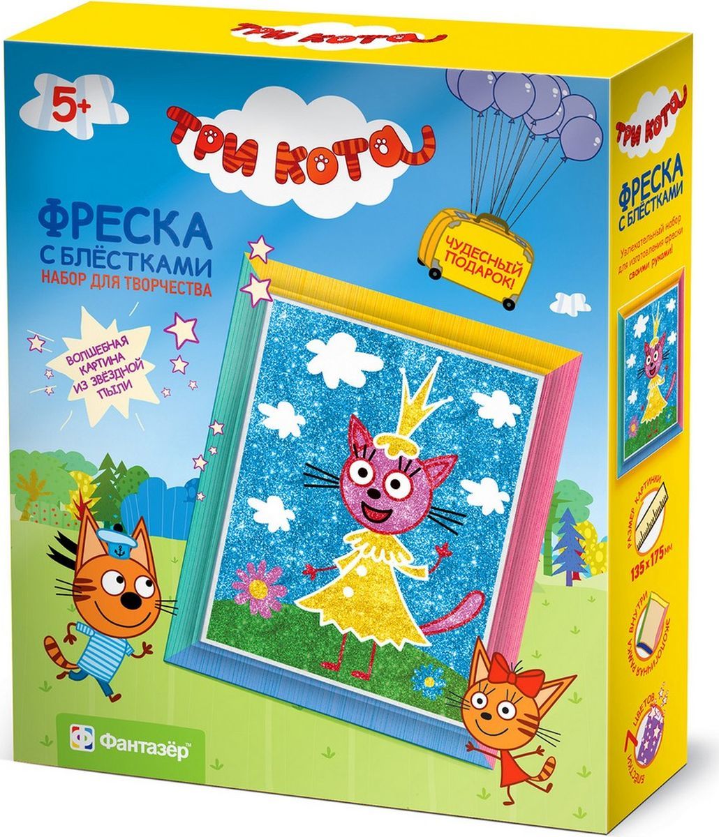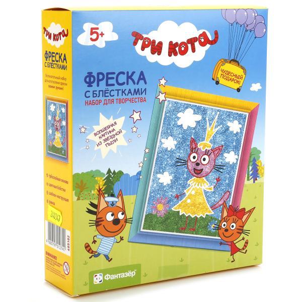 Набор для создания фрески Фантазер "Три кота Карамелька" - фреска представляет собой увлекательный набор для детского творчества, благодаря которому можно создать картинку, выполненную из песка. Для этого в набор входят все необходимые предметы, а благодаря рамке, также входящей в комплект, готовой картиной можно украсить интерьер детской комнаты.