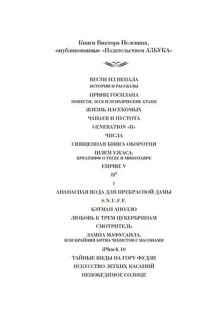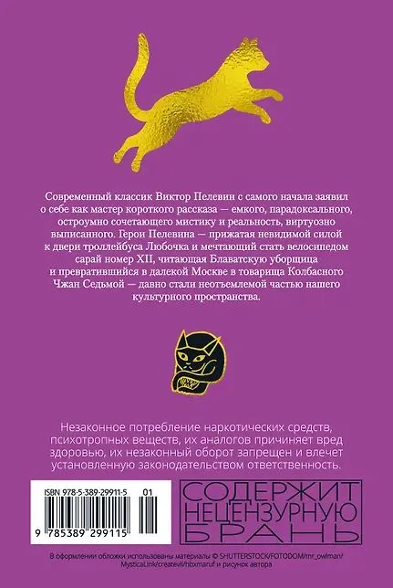Современный классик Виктор Пелевин с самого начала заявил о себе как мастер короткого рассказа — емкого, парадоксального, остроумно сочетающего мистику и реальность, виртуозно выписанного. Герои Пелевина — прижатая невидимой силой к двери троллейбуса Любочка и мечтающий стать велосипедом сарай номер XII, читающая Блаватскую уборщица и превратившийся в далекой Москве в товарища Колбасного Чжан Седьмой — давно стали неотъемлемой частью нашего культурного пространства.