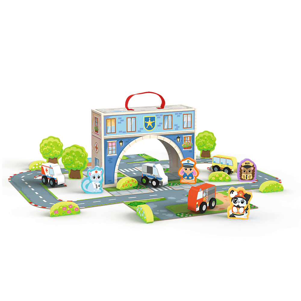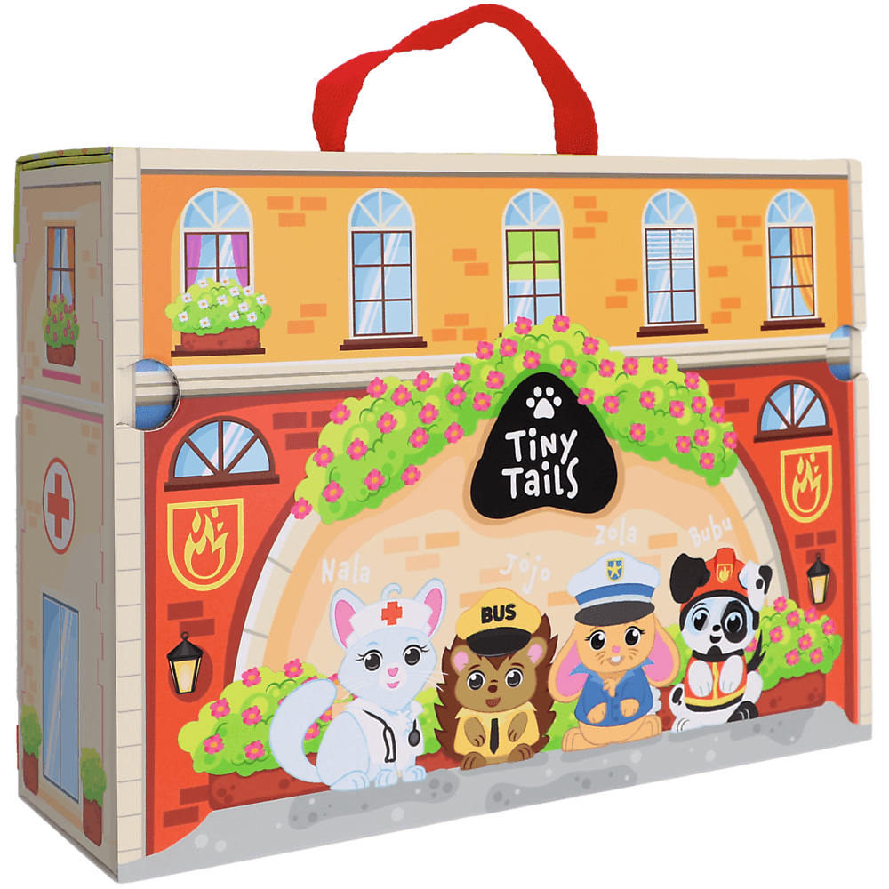 Магнитный сундук: Город от Tiny Tails — это магнитный сундук, наполненный деревянными фигурками и деталями пазла. Сундук не просто место для хранения и удобной переноски! Открыв, он превращается в город и становится местом для игр. Просто соберите пазлы из дорог, расставьте деревянные деревья, и вы перенесётесь в город. Там вас ждут животные и транспорт с важными функциями.