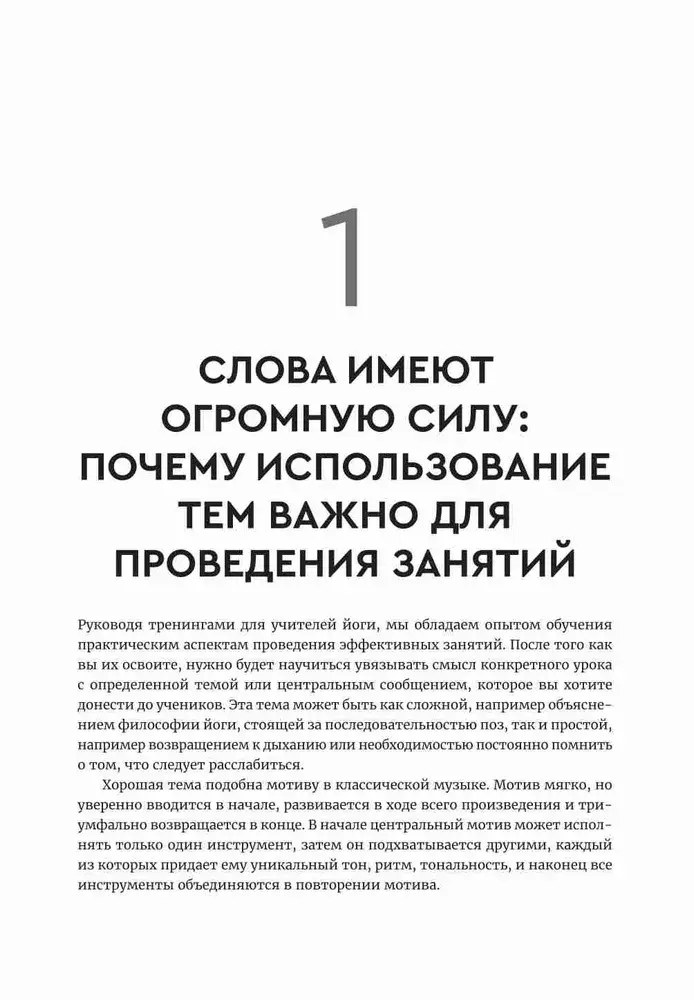 Это руководство будет полезно учителям, инструкторам и тем, кто занимается йогой самостоятельно и хочет поднять свои тренировки на новый уровень. Оно начинается с части, посвященной голосу, аутентичности, манере подачи материала, практике, повторению и источникам вдохновения. За ней следует вторая часть, где предлагается более 50 готовых тем, которые вы можете положить в основу своих занятий. В последней части приводятся шаблоны для создания ваших тем и записи идей.