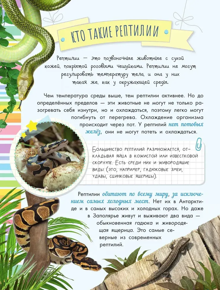 Кто-то восхищается красотой этих животных, кто-то боится. В нашей детской книге биолог, сотрудник Зоомузея Зоологического института РАН в Санкт-Петербурге Александр Острошабов понятно и легко рассказывает о самых интересных рептилиях – черепахах, змеях и ящерицах. Информация обязательно пригодится ребенку не только в школе на уроках биологии, но и во время отдыха, загородных походов, прогулок в парке. Яркие натуралистичные иллюстрации помогут лучше понять мир этих необычных существ и проникнуться к ним если не восхищением, то симпатией.