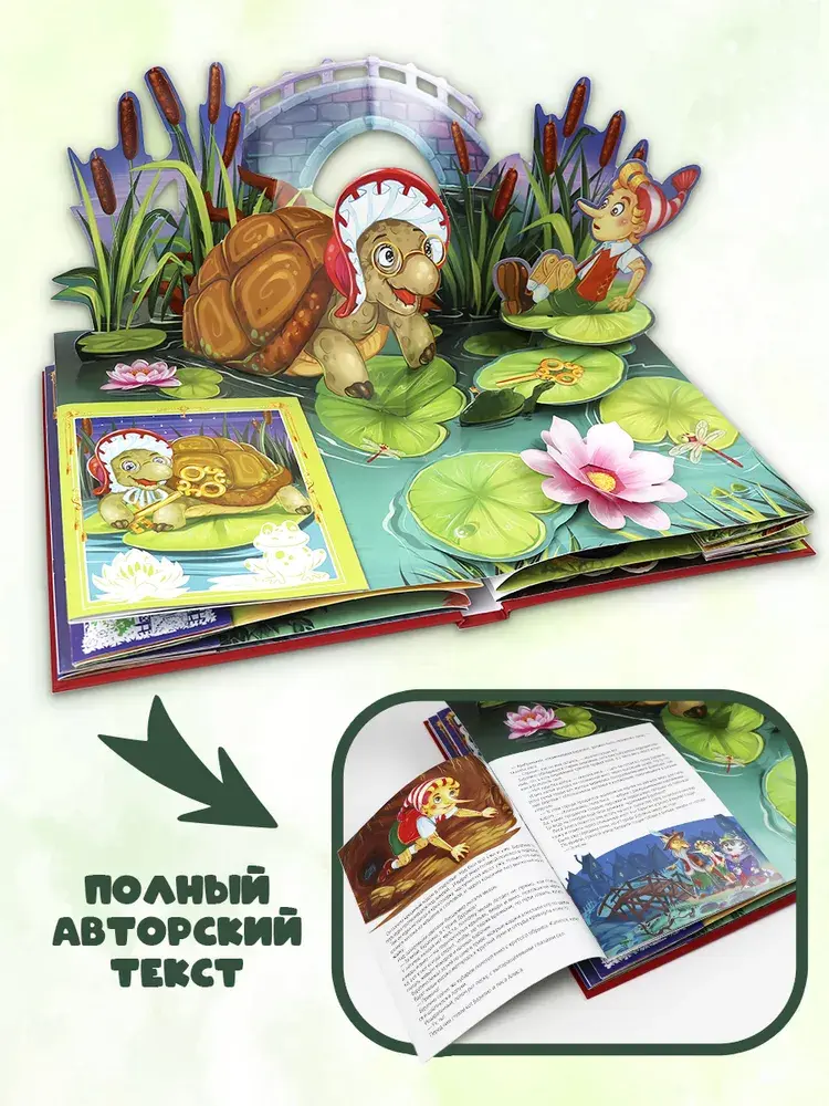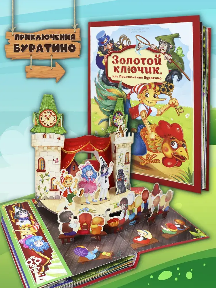 Знаменитая и всеми любимая повесть-сказка Алексея Толстого о приключениях деревянной куклы Буратино и его друзей — Пьеро, Мальвины, Артемона. Отправляйтесь на поиски золотого ключика и помогите папе Карло открыть заветную дверь за нарисованным очагом! Полный текст произведения и огромные POP-UP конструкции на каждом развороте позволят окунуться в атмосферу приключений. Новая подарочная книги из серии «Золотая коллекция сказок» от торговой марки Malamalama — настоящее сокровище любой книжной коллекции!