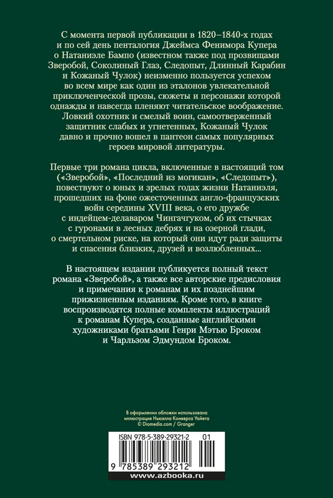 момента первой публикации в 1820–1840-х годах и по сей день пенталогия Джеймса Фенимора Купера о Натаниэле Бампо (известном также под прозвищами Зверобой, Соколиный Глаз, Следопыт, Длинный Карабин и Кожаный Чулок) неизменно пользуется успехом во всем мире как один из эталонов увлекательной приключенческой прозы, сюжеты и персонажи которой однажды и навсегда пленяют читательское воображение. Ловкий охотник и смелый воин, самоотверженный защитник слабых и угнетенных, Кожаный Чулок давно и прочно вошел в пантеон самых популярных героев мировой литературы. В настоящий том включены первые три романа цикла, повествующие о юных и зрелых годах жизни Натаниэля, о его дружбе с индейцем-делаваром Чингачгуком, об их стычках с гуронами в лесных дебрях и на озерной глади, о смертельном риске, на который друзья идут ради вызволения из плена возлюбленной Чингачгука, защиты семейства Хаттер («Зверобой») и спасения дочерей британского полковника Манро («Последний из могикан»), о любви главного героя к дочери его давнего друга, сержанта Томаса Дунхема, и о его самопожертвовании во имя чужого счастья («Следопыт»). Публикуется полный текст «Зверобоя», восстановлены все авторские предисловия и примечания к романам и их позднейшим прижизненным изданиям. В книге воспроизводятся полные комплекты иллюстраций к романам Купера, созданные английскими художниками братьями Генри Мэтью Броком и Чарльзом Эдмундом Броком.